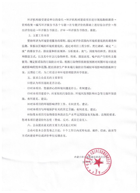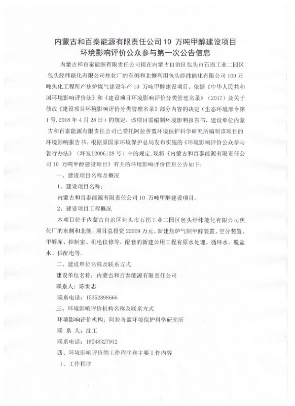 内蒙古和百泰能源有限责任公司10万吨甲醇建设项目环境影响评价公众参与第一次公告信息